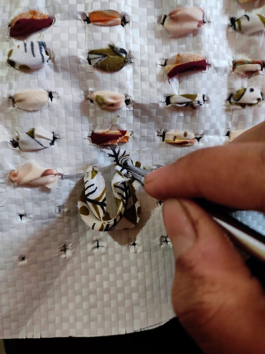 Once that is done the front side will look like this. The background is covered by the shreds. Cover the whole bag and then add the belt on both ends of the bag. Cover the insides by another plastic bag cutout or cloth.