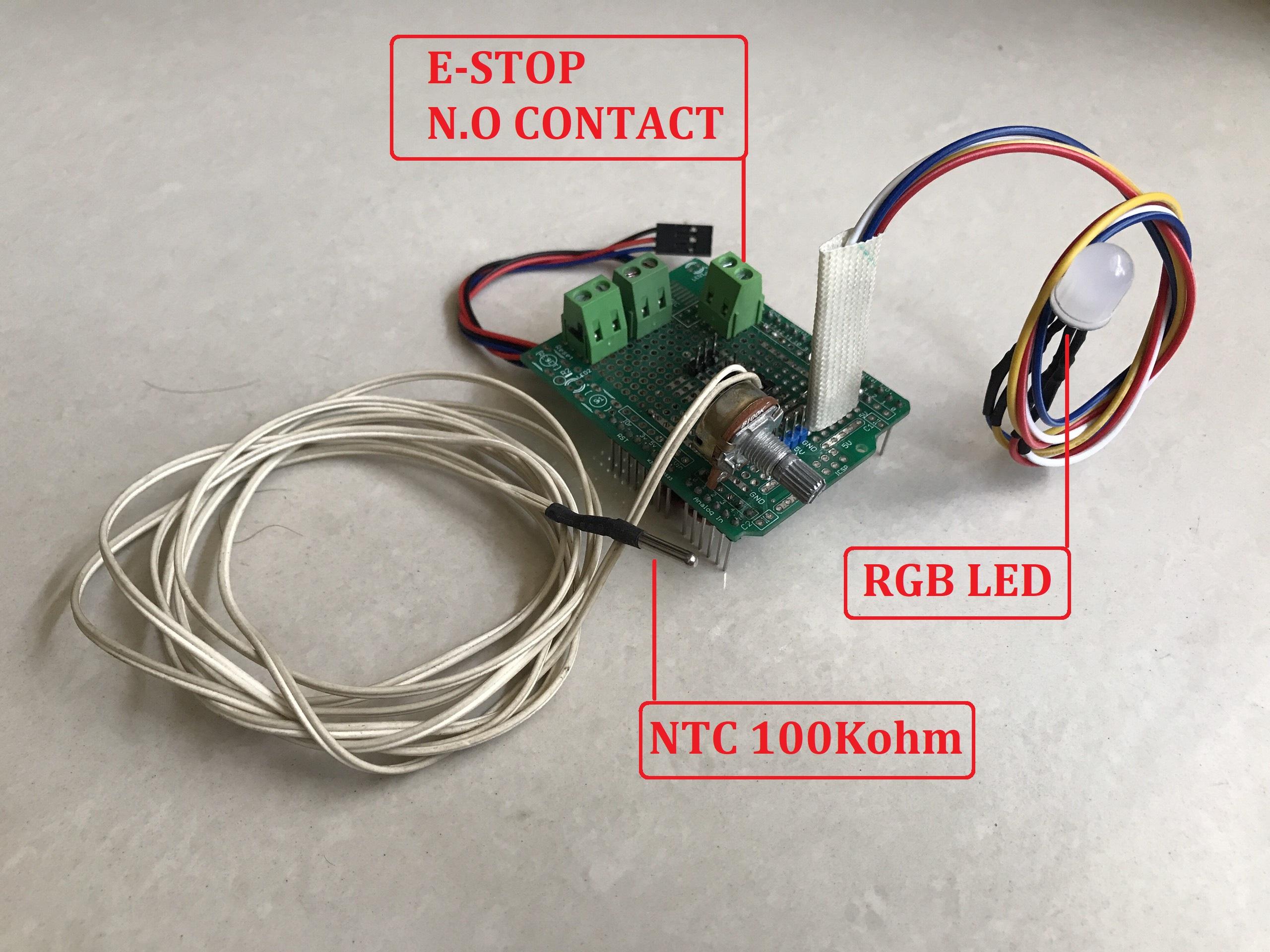 I added one thermistor NTC 100KΩ, RGB led common cathode 10mm, and one header for N.O contact of emergency button (it has one N.O and one N.C contact). Instead of putting a 100KΩ resistor in series with the themistor NTC, I used a 100KΩ potentiometer so I could adjust the value I wanted. And I can also do transformer winding temperature simulation.