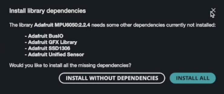 - Install the Adafruit MPU6050 library with all corresponding dependencies