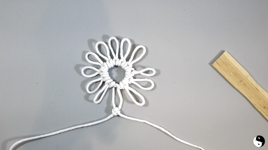 When back to the beginning, form a double knot to bring the two ends together. This makes the 12th loop. Every time you finish a row, you will knot the two ends together. Make sure that the tail ends up on the left side – without twisting. If it does, remove and re-knot again.
