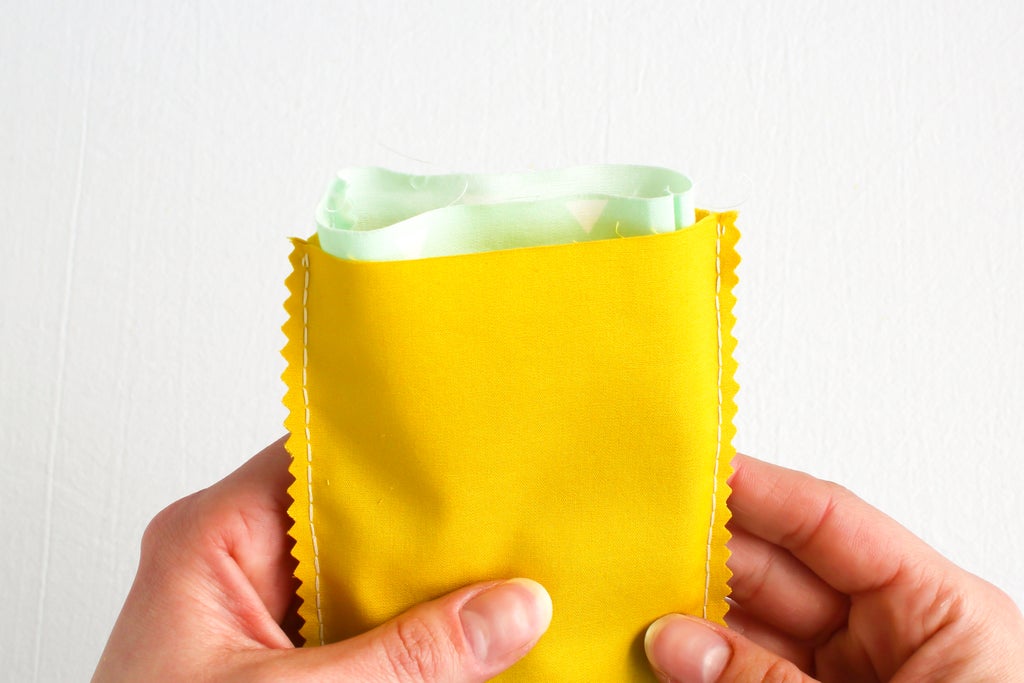 Turn the outer fabric right side out. Be gentle while turning! Even with the extra stitch for reinforcement at the top of the seam, it's still possible to pop the stitches with too much force.