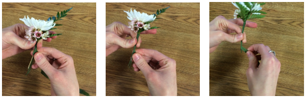 Adhere floral tape to the base of focal flower (G.) stem to cover wire. Twist the tape downward towards your body until the wire is completely wrapped, rolling it between your thumb and index/middle fingers. Pinch off excess tape at the end.