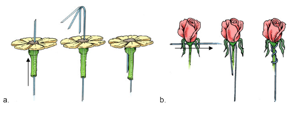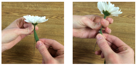 a. if using daisy/mum- cut a 6” piece of wire (cut at slant to create sharp point), pierce wire through the base of the daisy, pushing up through the stem carefully. The wire should come up through the center of the flower. Gently create a small hook at the top of wire and then carefully and slowly pull down until hook somewhat disappears in the center of the daisy.