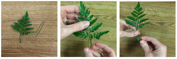 Cut a 5-6” piece of wire (D.); bend wire in half (should look like a hairpin); hook the wire to the lowest “branch” on the greenery. Tape greenery using the same technique as with the focal flower (remember to stretch slightly until sticky).