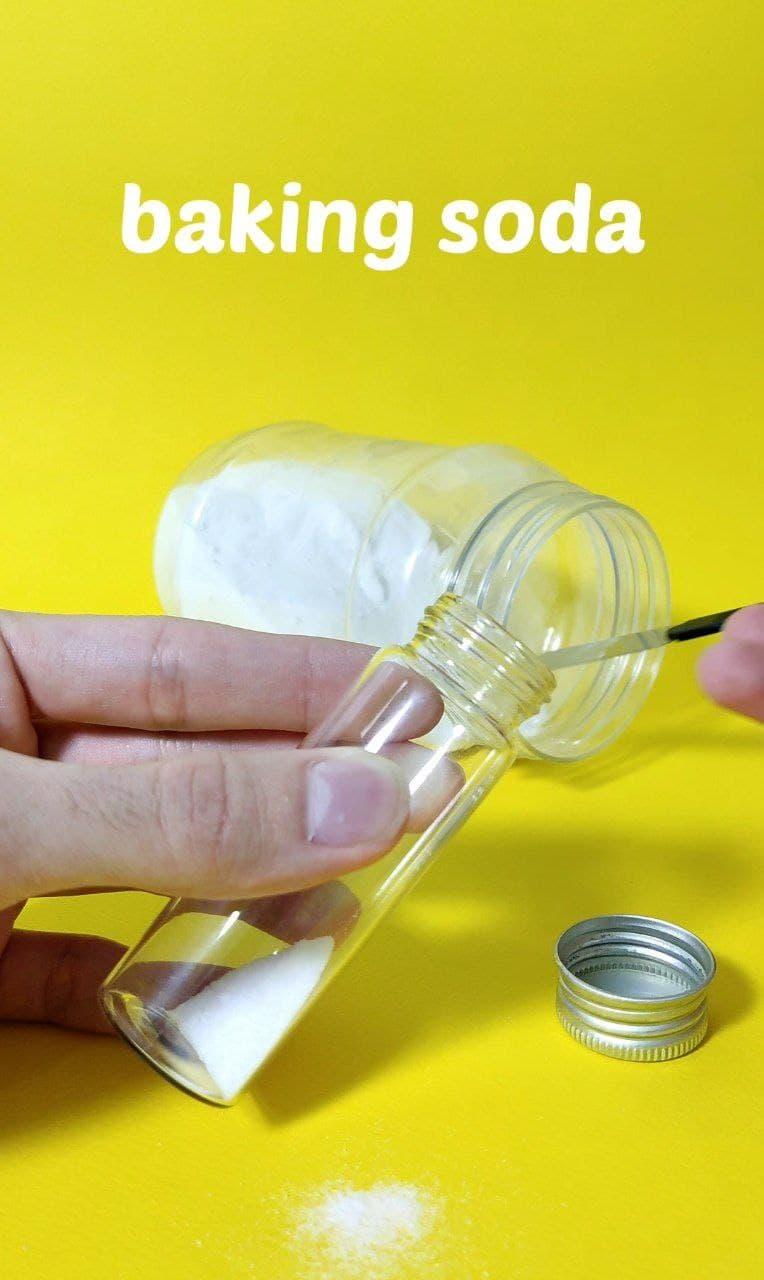 Pour the baking soda into the jar. Cover the bottom of the Glass jar a few millimeters.