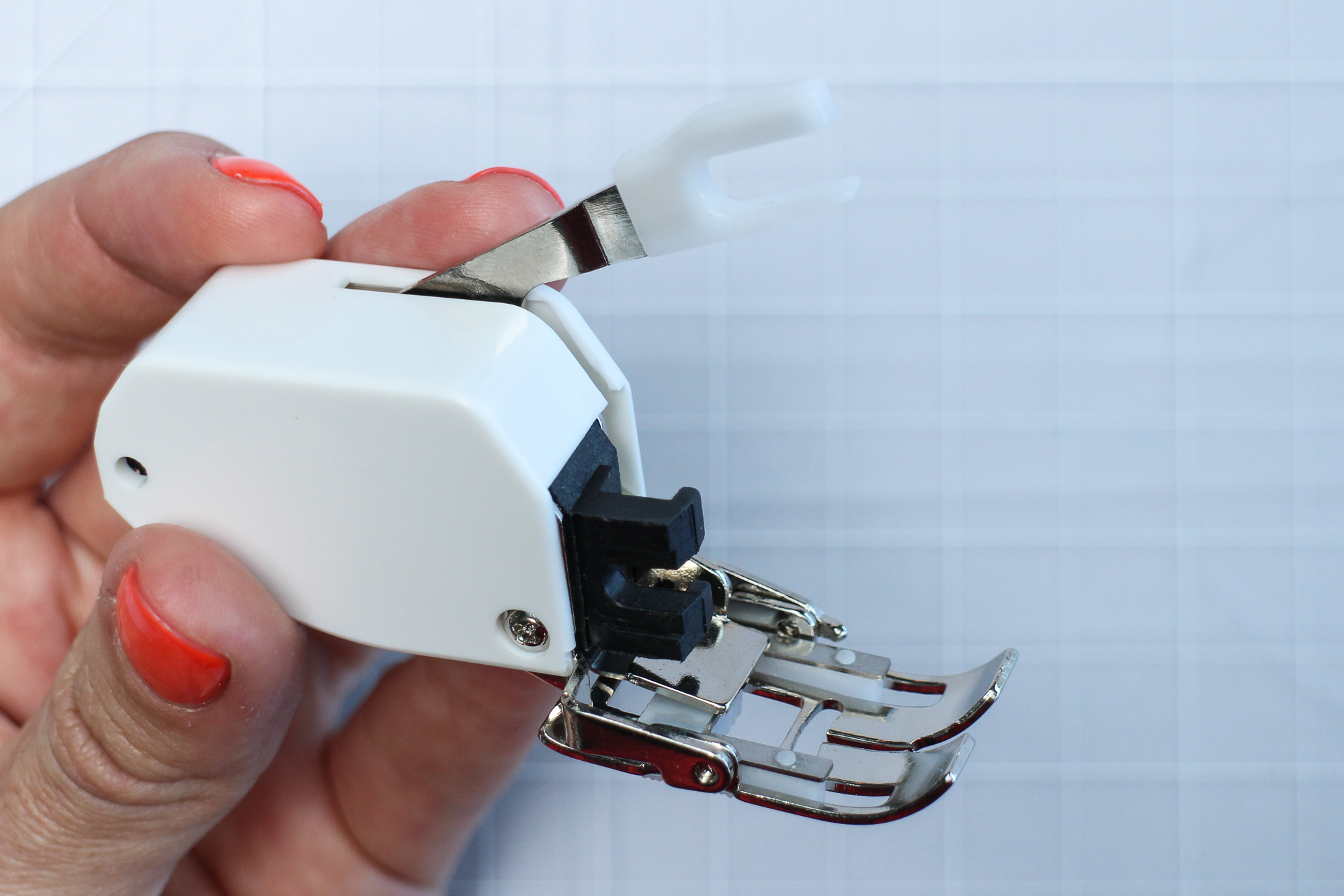 If your machine lets you adjust the pressure of your presser foot decreasing the pressure can help prevent stretch fabric from stretching or puckering while you sew as you can see in the photo below.