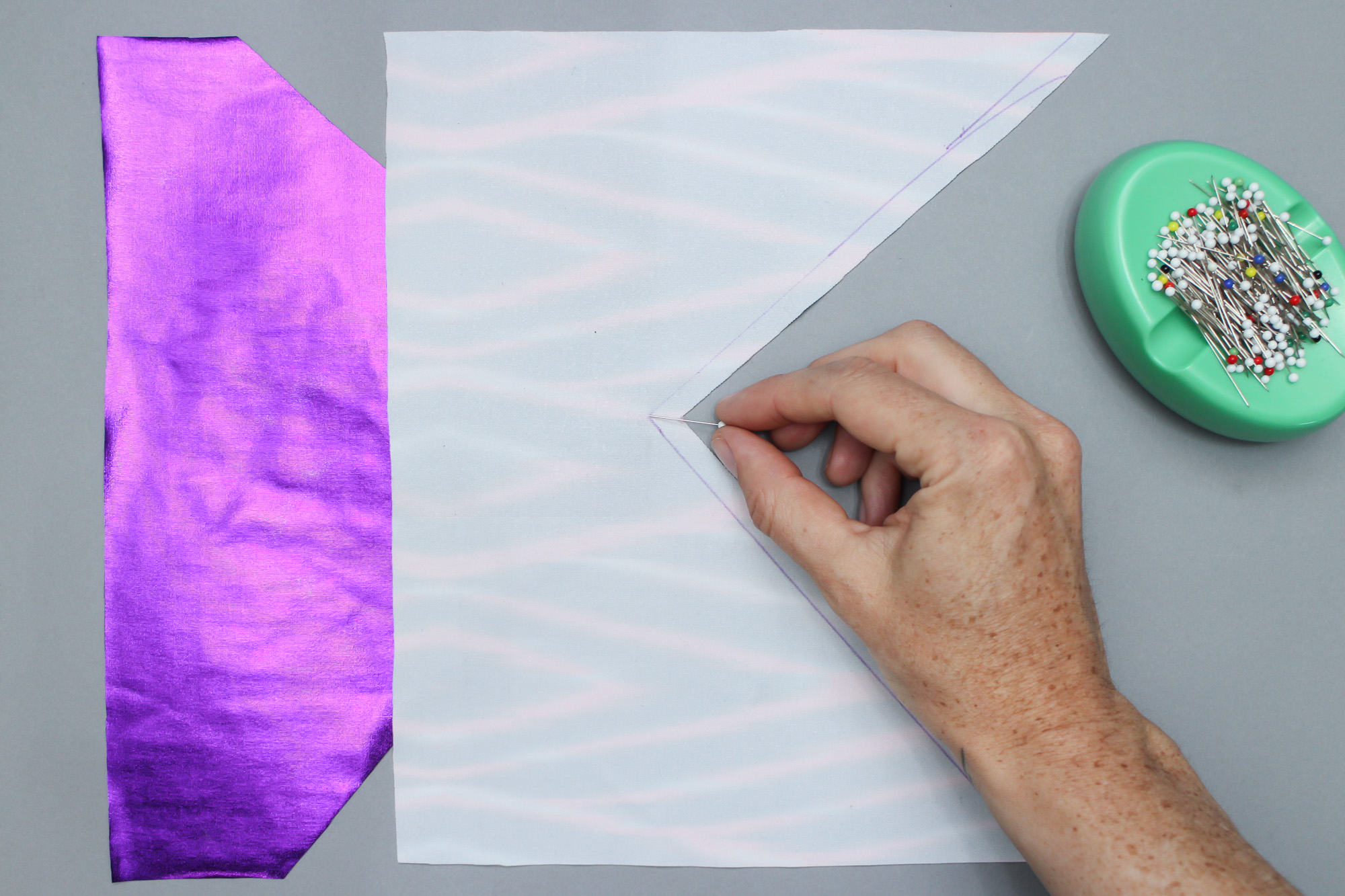 I discuss this when I'm sewing a mock-up in my Designing a Spandex Supersuit instructable, but sewing the inseam on a pattern like this can be a bit tricky because the shapes of the two pieces are opposite each other, the back is a point, and the front is a V. To pin these two pieces together, match the crotch points and place a pin here.