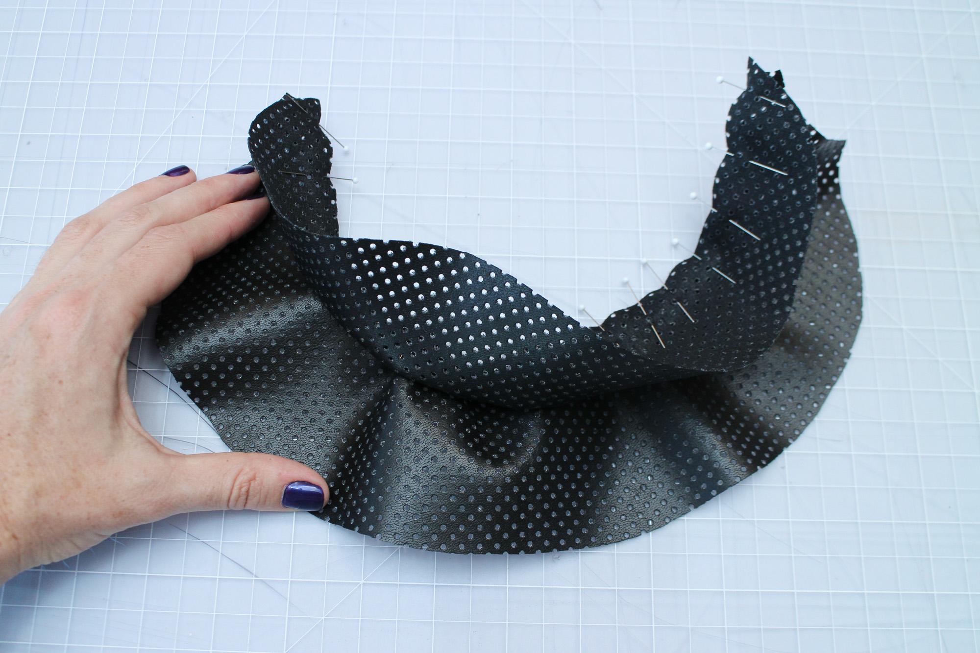 My black perforated spandex is somewhat sheer, and in some areas, like the waist and butt, I wanted to line it. To do this I simply lay the self on top of the identical lining piece, pinned them together, then sewed in the doubled panel as if it was one piece.