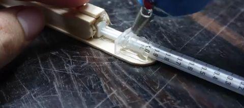 Glue the barrel of the 3 trigger syringes to the surface of a 150mm x 18mm stick and trim the excess piece . The group of the trigger syringe is named activator.