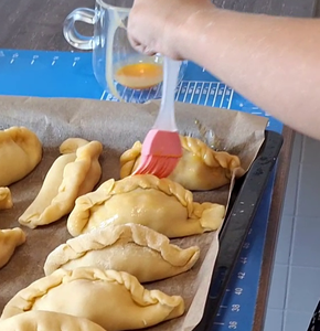 Take the third egg and crack it into a bowl. Mix the yolk and white together. Brush the pies with this egg. You can use a spoon, a brush like we did, or even your finger. :)