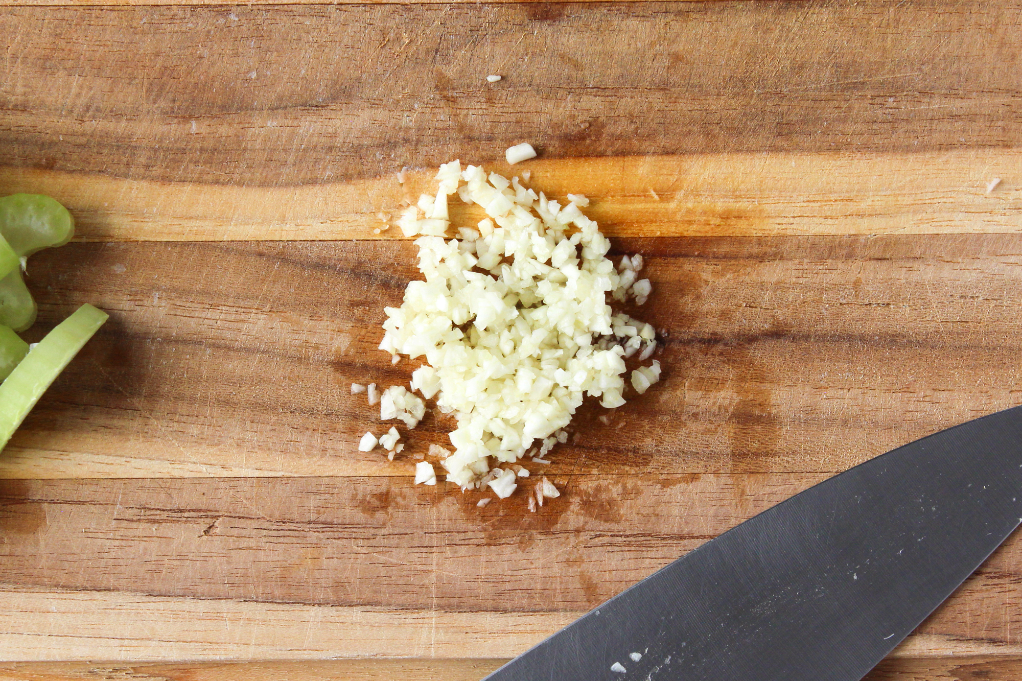 When mincing, keep your dominant hand on the knife handle and place your other hand flat on the top of the blade. Rock the knife back and forth, using the hand on the top of the blade to keep pressure on the cutting board.