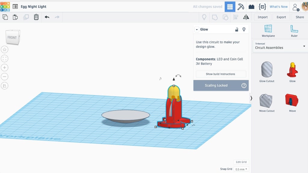 Tinkercad recently added two Circuit Assemblies to their shape menu offerings, one of which is the Glow Assembly, a plug-and-play LED circuit shape that I used to make my Egg shine bright.