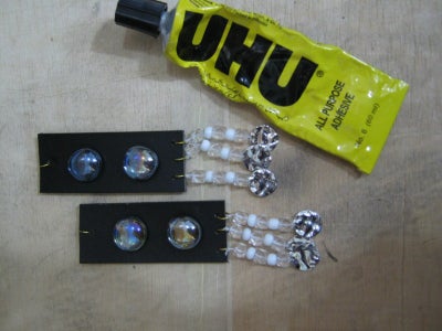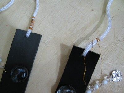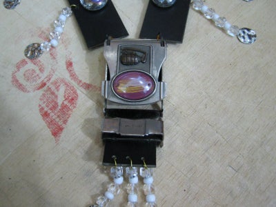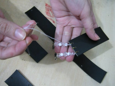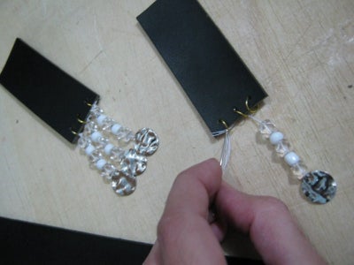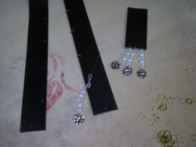 Putting the beading into the thread using needle and hanging the series of beads on the belt pieces knotting them with the little wire rings. Start with the earrings, then on the necklace pieces and in the end hang them on the below of the belt buckle.