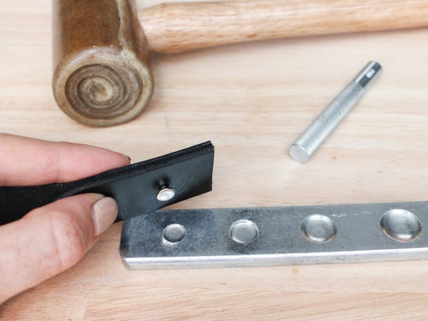 Use your rivet setter and mallet, or hammer, to set the rivets.