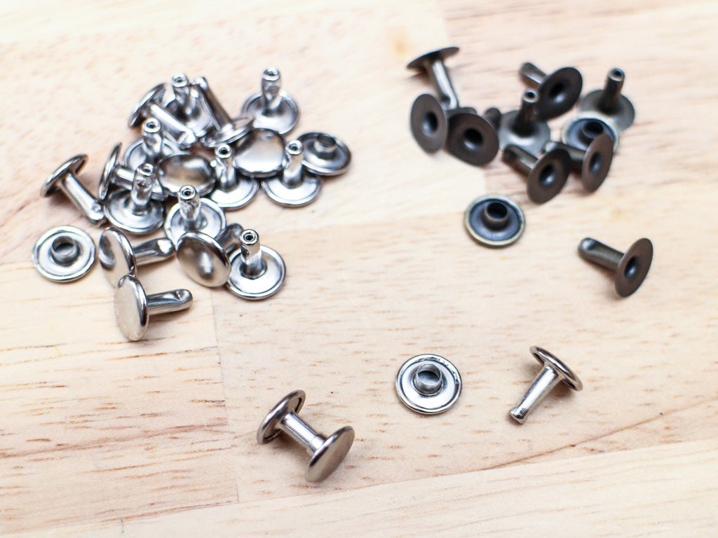 Rivets are one of my favorite leatherworking tools because they are just so easy to use, and I love the way they look. Rivets let you attach two or more pieces of leather together when they are set through holes in the leather. They come in a variety of finishes so you can choose rivets that intentionally stand out against your leather or rivets that blend in. There are a few different kinds, but I'm just going to show you the easiest for now.