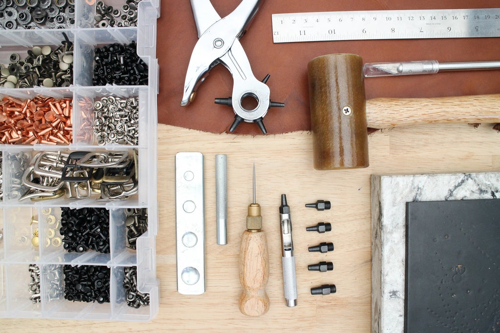 Now that we've learned how to cut and fold leather, we're going to learn how to attach pieces of leather to each other by one of the simplest methods: riveting. Riveting requires hole punching, so we'll also take a look at a few different tools for punching holes. Then we'll put all these skills together to assemble our wallet!