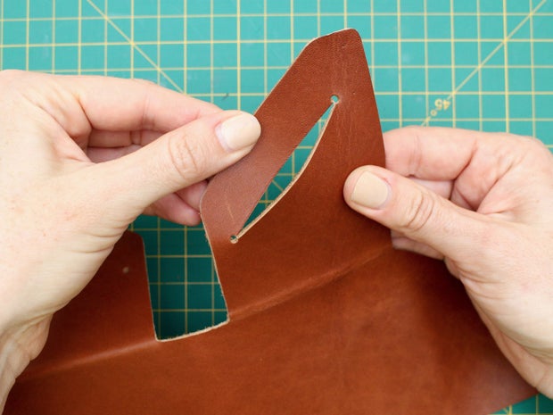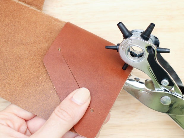 First, take one flap and fold it, lining it up so the outside edges of the leather are perfectly even and the fold is laying flat. Holding the two layers in place with the flap facing up, use a rotary hole punch to punch a hole through both layers at one of the rivet positions you marked from the pattern.