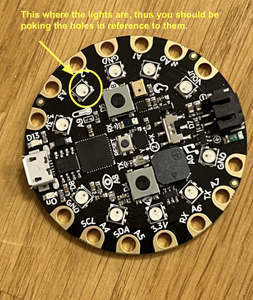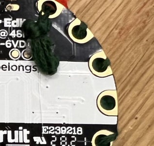 Then, take the dark green embroidery thread and stitch the felt to the cpx through the holes you poked through and the holes that line the outside of the cpx (as seen in the picture above). Once you have gone through every hole, tie the end in a tight knot and hot glue it to the back of the cpx so it is hidden.