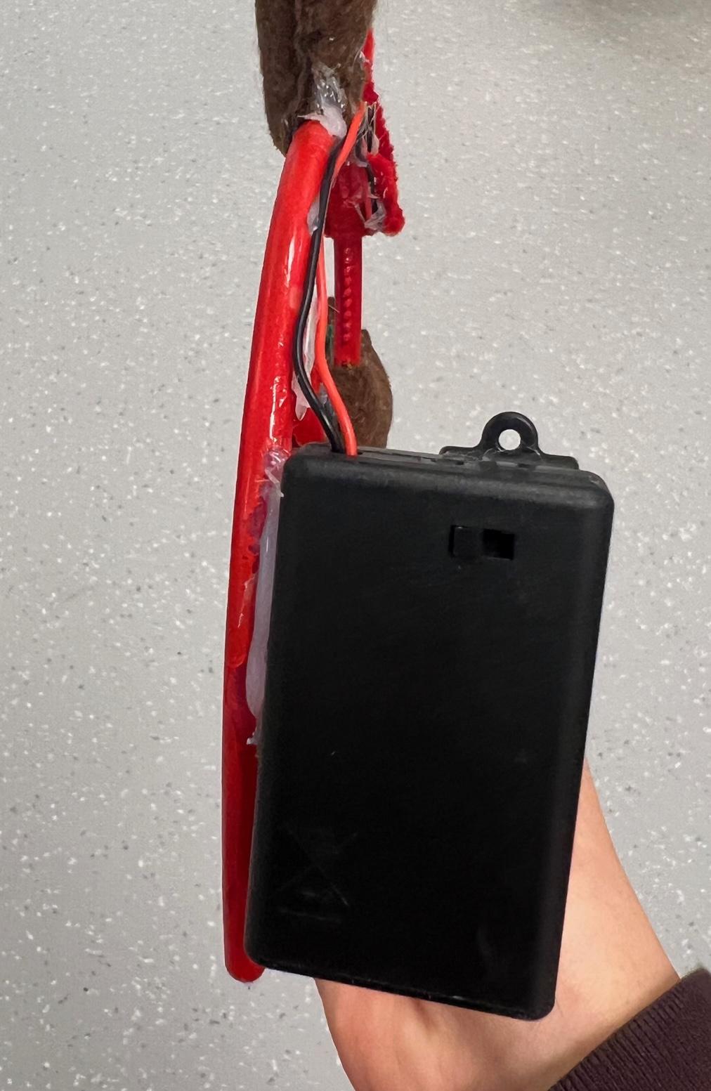 If that hasn't secured the cpx on and it is not upright, take the red pipe cleaner and wrap it around the rectangular part of the cardboard until the cpx is secured and hot glue the ending to the back.