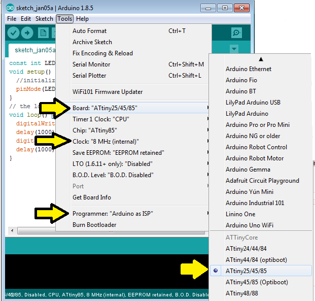 - Make sure the board selected is still the ATTINY85 Clock: 8Mhz (internal)