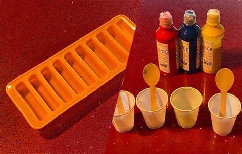 Add a small amount of Tempera (both liquid or powder works) to each of your cups. A small amount will go far for colouring the plaster and mix well.