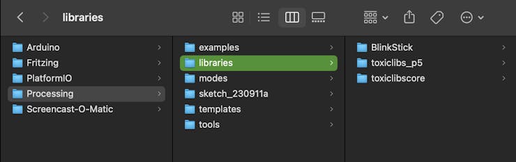 For the toxiclibs library, you only need two subfolders for the example code to run. Once you download the library extract the toxiclibs_p5 and toxiclibscore subdirectories into the Library folder under Processing. Screenshot shown here.