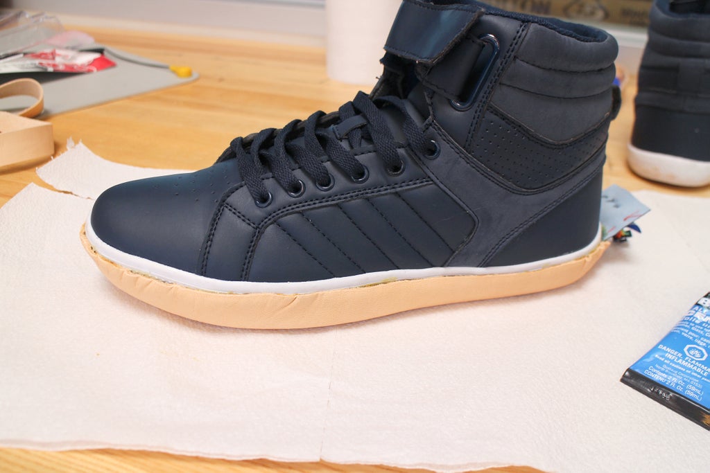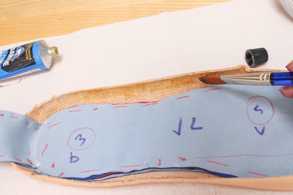 Grab the Barge glue and apply to the inside top edge of the leather sole and on the shoe's side where the sole overlaps. Press the leather sole onto the shoe smoothing out any wrinkles. Apply glue to the leather strip and cover the top edge of the sole with it all the way around to the back. Next, apply glue to the semi-circle and press that over the heel extension to cover it up and secure it to the shoe.
