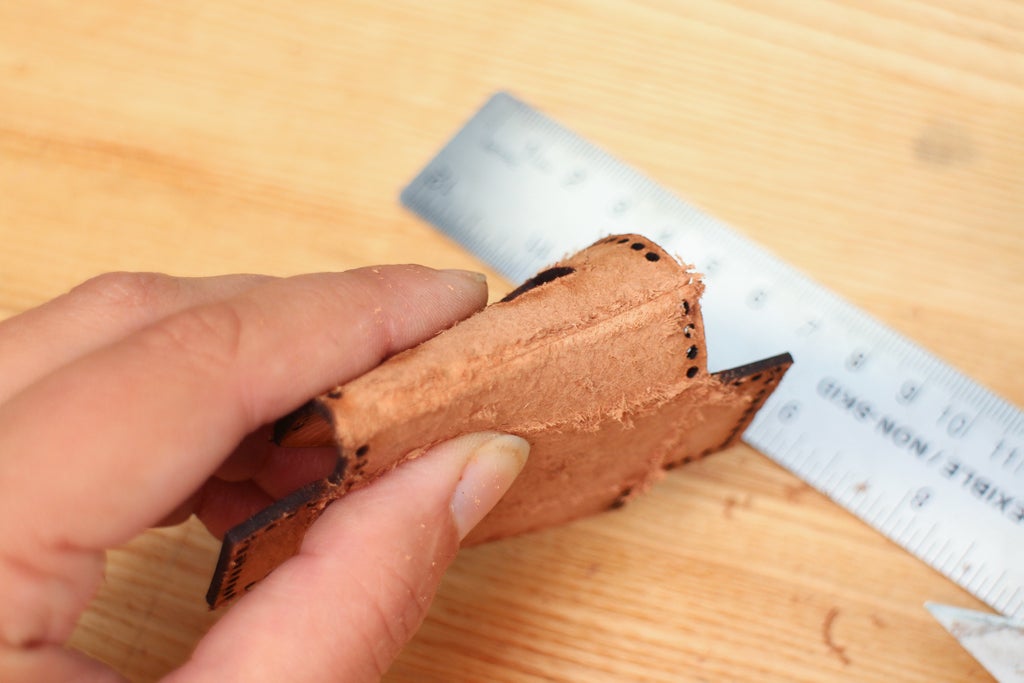 Double up some thread and knot the end. To begin thread the needle through the first set of holes, grab the end of the thread and make a square knot. Sew together the sides going through each set of holes multiple times. Glue velcro onto the flap so it securely closes over the hardware.