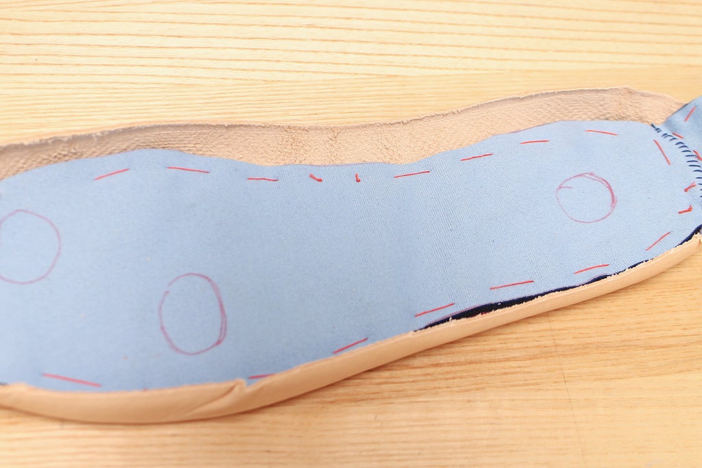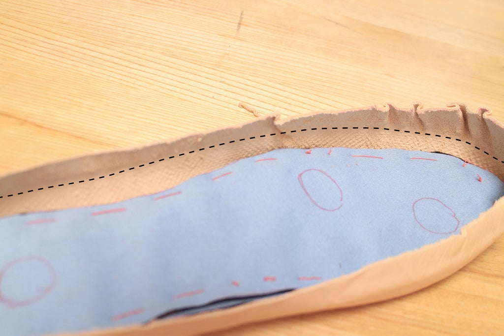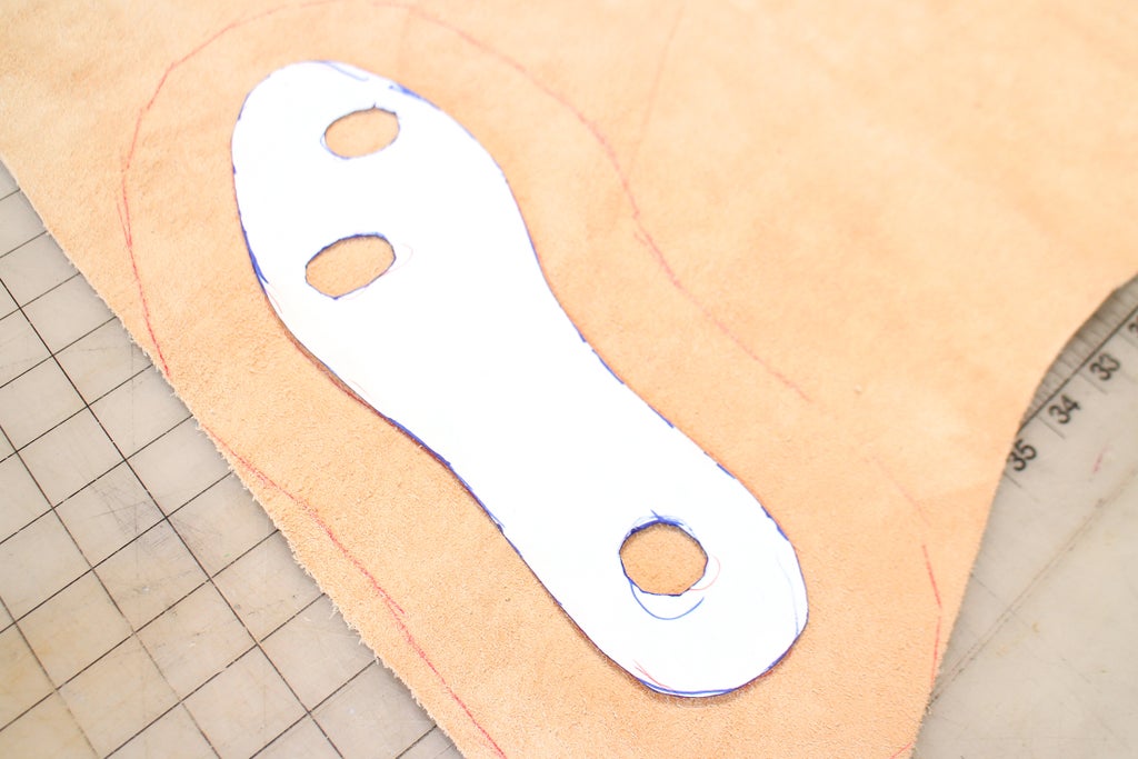 Trace the sole pattern onto the back of the leather then measure and mark a 1.5" - 2" border all around. Cut this piece out, flip it and use it to cut another piece from the leather.