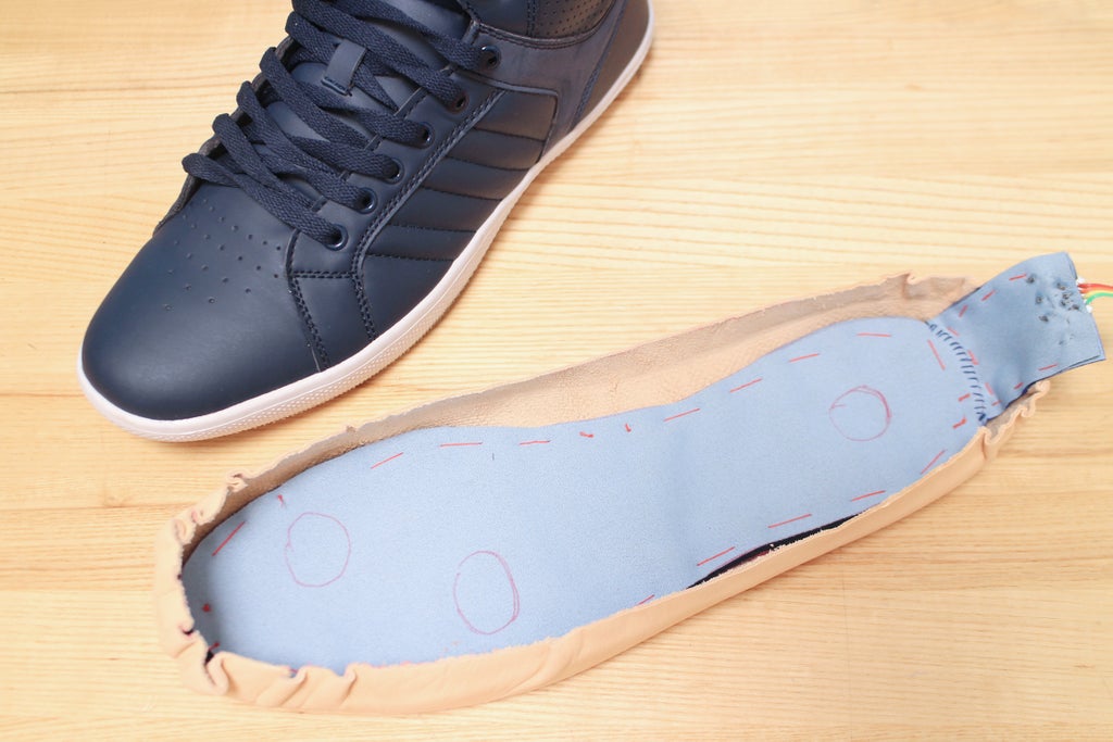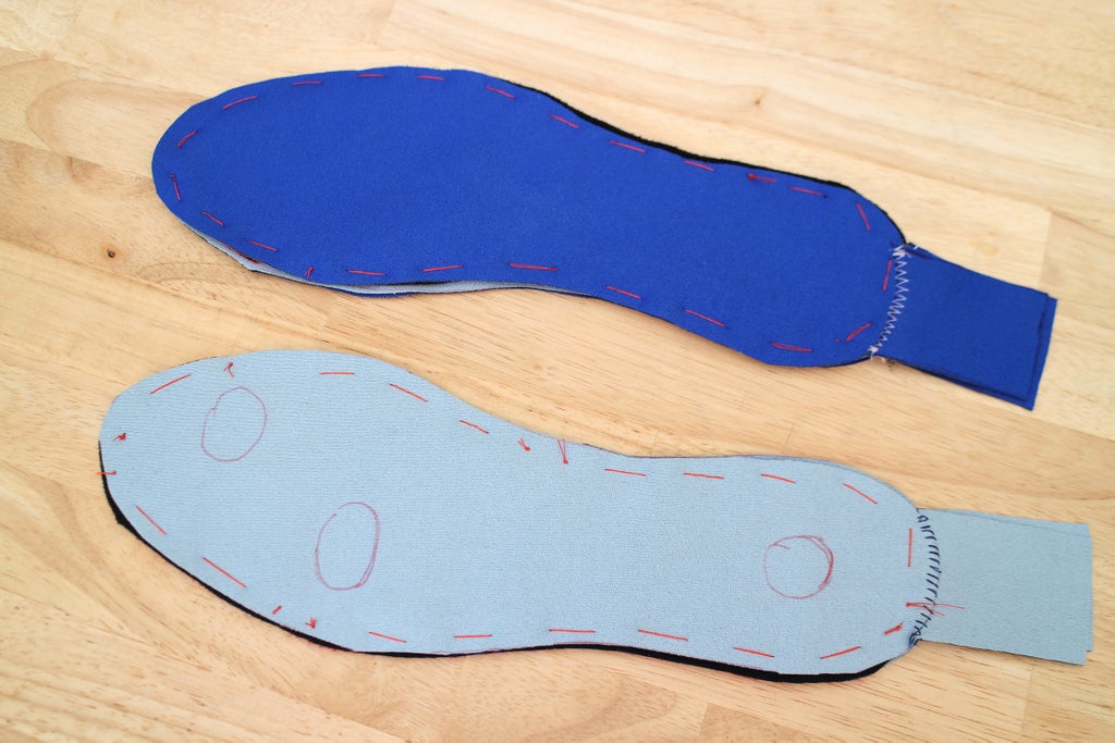 If all the switches are working grab a needle and thread and stitch the layers together around the edge and up the heel extension stopping at the top of the traces. Your soles switches are ready!