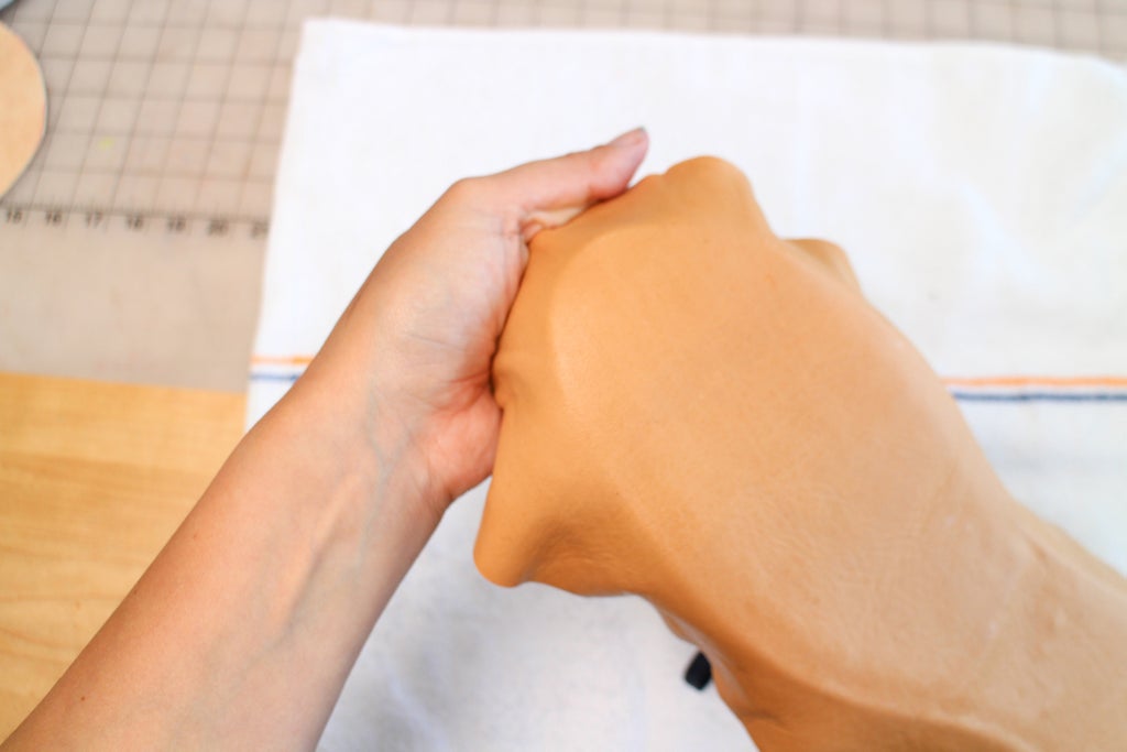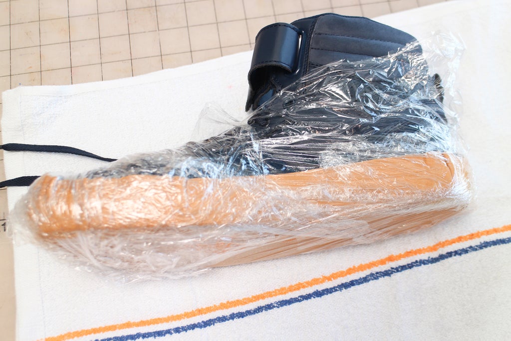 Place the leather pieces in a bowl of warm water and let them soak for a minute. Take a piece out and squeeze out any excess water back into the bowl. Turn the shoe upside down and start to smooth and stretch the leather around the bottom of the shoe. Stretch the leather up and over the sole's edge creating a wall that travels up onto the side of the shoe all around. Smooth out any wrinkles that occur as best as you can, it doesn't have to be perfect. Secure the leather by tightly wrapping Saran Wrap around where the leather bends up the side of the shoe. Let dry overnight.