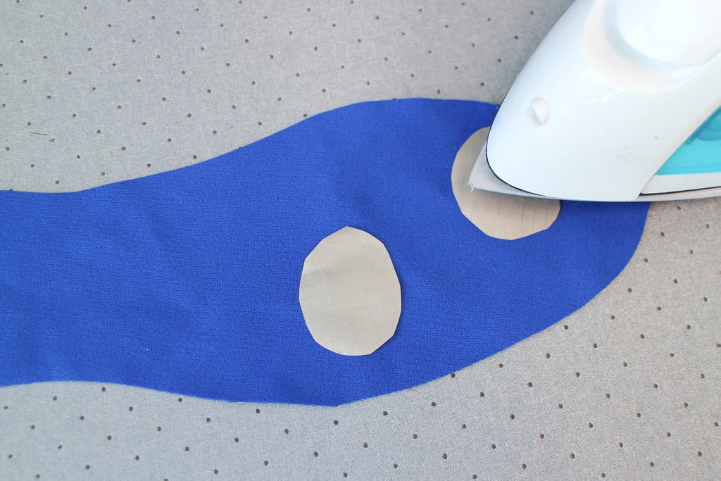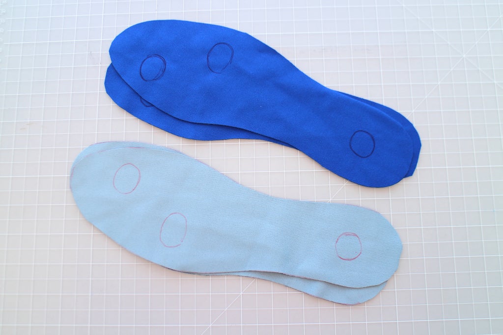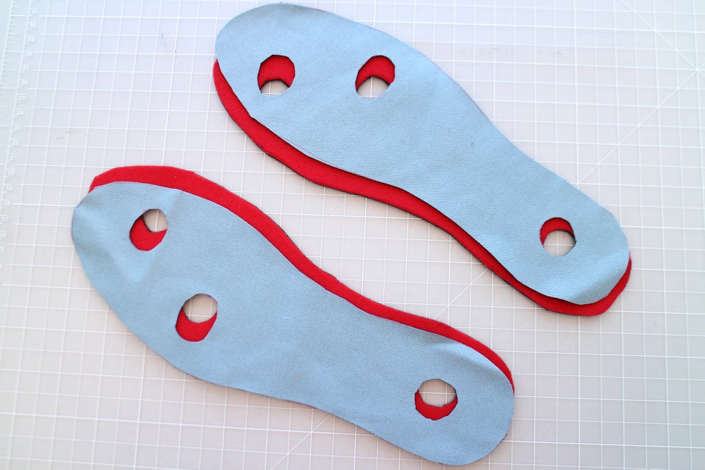 Use the holes cut from the paper pattern to trace a switch shape onto the white side of the conductive fabric. Draw a 1/4" border around the shape and cut out. Repeat with each switch cutting two for each switch that mirror each other. With three switches on each shoe, you should have a total of twelve in the end. Iron them on the top and bottom sole pieces over the markings you made.