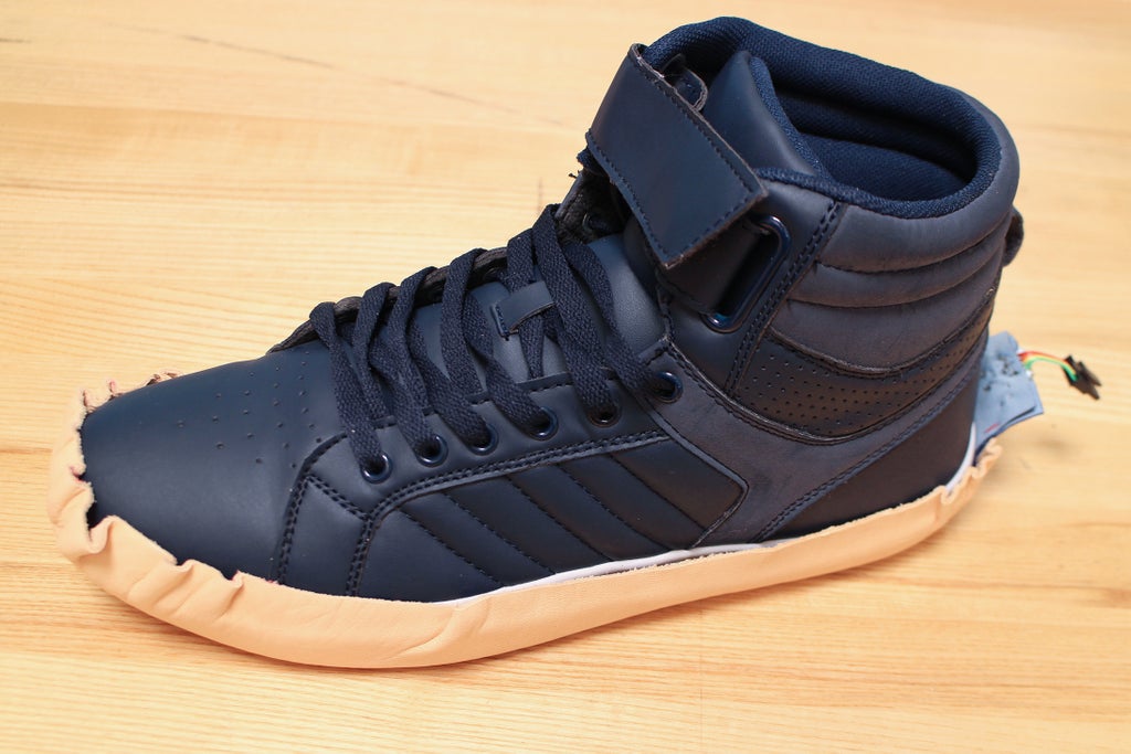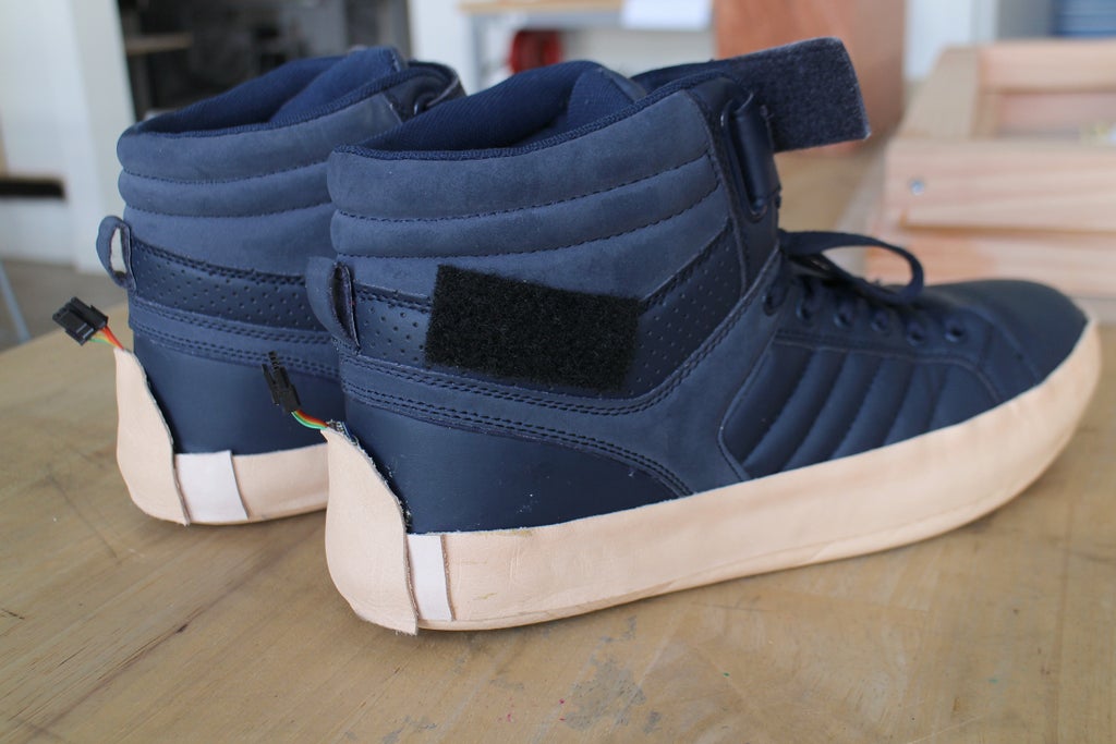 It's always best to start with a prototype when building something interactive. Since the shoes were to be identical I started by making and testing one shoe. I thought about some obvious places where the switches could be. I put one switch on the heel, the ball of the foot, and on the big toe. Everything got taped and velcroed together so it could be removed later. Make sure that the Vecro and tape are strong enough to hold things in place. You want the prototype to hold together well enough to get an accurate representation of the final build.