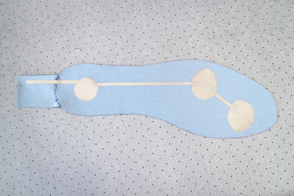 The switch contacts are now in place! Time for the rest of the circuit. Cut strips of conductive fabric 3/16" wide. Each sole has top and bottom contacts. The bottom contacts all go to ground on the microcontroller so they all get connected. For the top contacts each gets connected to their own digital input pin on the microcontroller so they get their own trace.