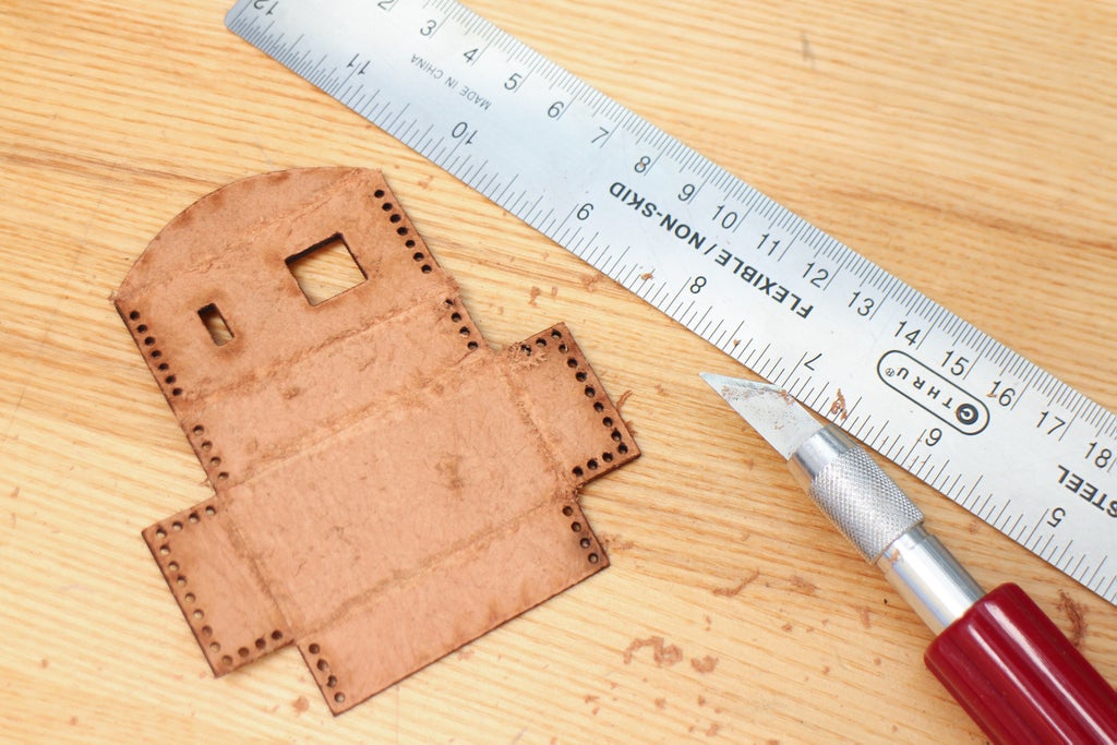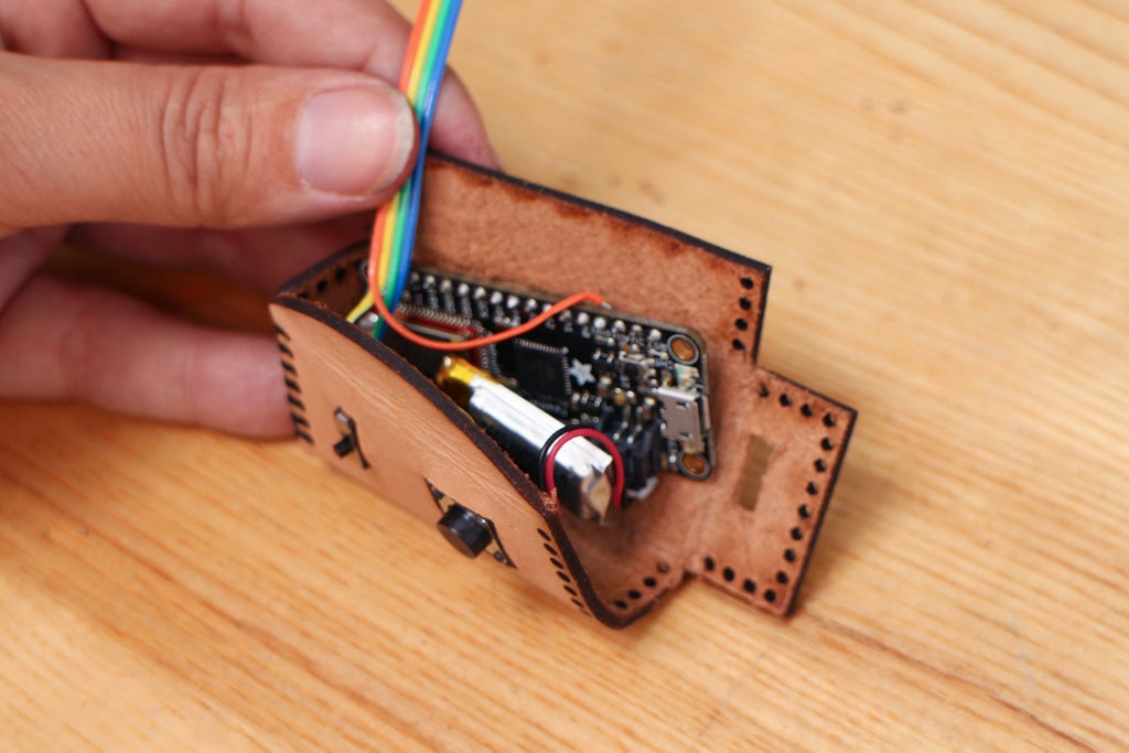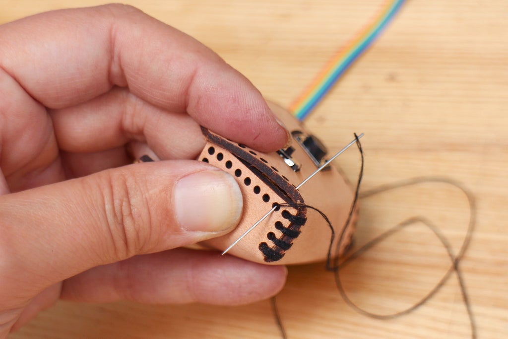 The circuit and battery get tucked into a case which the on/off switch for power and the middle switch also get mounted to. The case can either be laser cut or by hand. To make sewing easier the holes are precut in the leather. I based my design on one made by my awesome leatherworking co-worker Mikaela Holmes. If cutting by hand the holes can be punched using an awl to making sewing a little easier.