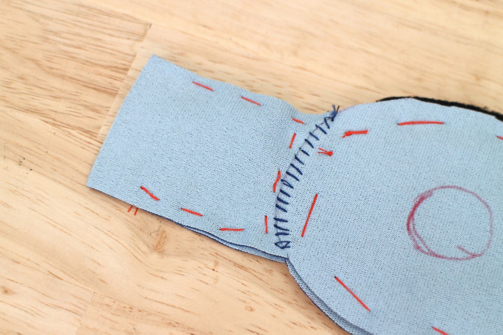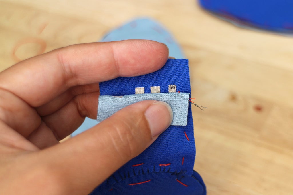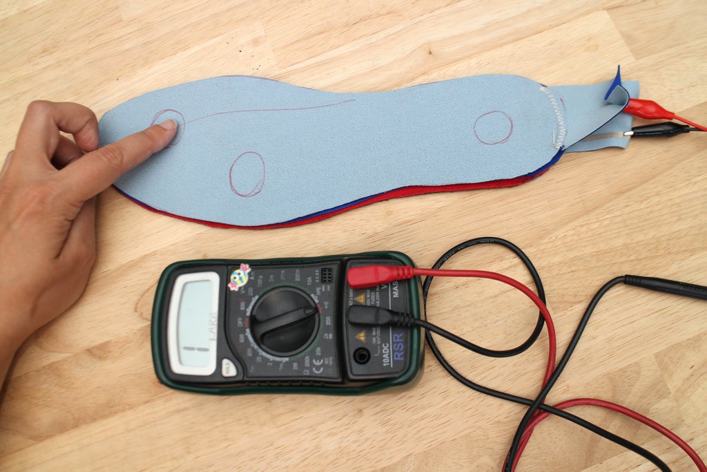 After the connections are checked stack the layers of each sole together to get ready to test each switch. Stitch the layers together using a basting stitch. Clip an alligator lead to the one ground lead and one to one of the switch leads. Press to test, if you hear a beep readily the switch is working! If not, disassemble the layers and check your connections again.