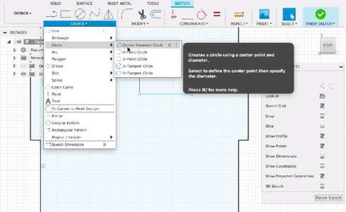 - In order not to make a mistake we will delete the 33mm guide line, then we select "CREATE", "CIRCLE" and click on "CENTER DIAMETER CIRCLE", we will create 2 circles in each corner of the 15.75mm line (circle measure is 3mm). Finally we remove all the guide lines we already used and click on "FINISH SKETCH".