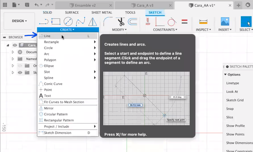 We will start by creating a sketch, we save it under the name "SIDE A". click on the icon "CREATE SKETCH" and choose the axis surface (X, Z).