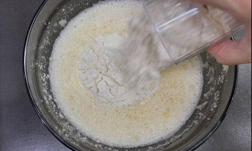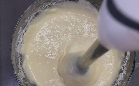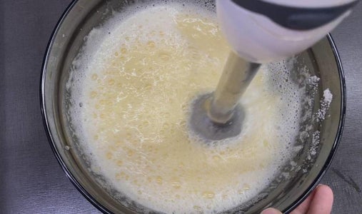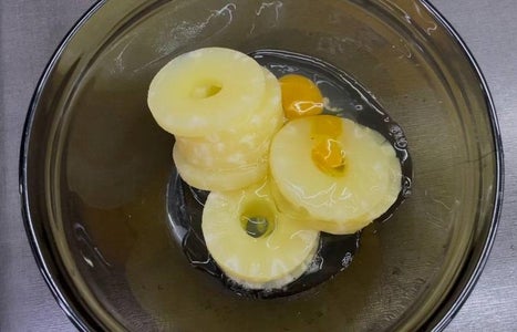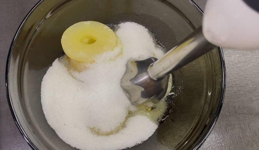 Blend the eggs, sugar, and pineapples (without juice) using an immersion blender until smooth. Add the oil and blend again.