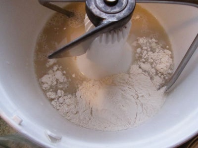 In a large mixing bowl, preferably a stand mixer, stir yeast and honey {or sugar, which ever you picked} into warm water. Let sit for a minute. Pour in salt, oil and half the flour and mix.