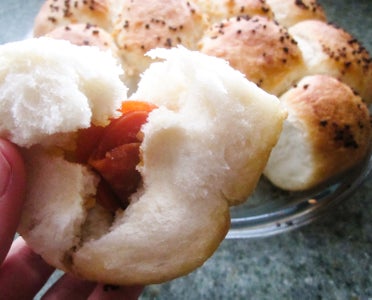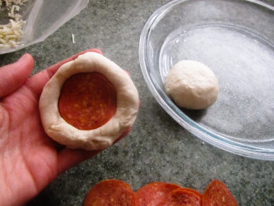 Take one of the dough pieces,squish the middle and put 2-3 slices of pepperoni and then a cube of cheese, or approximately 2 tablespoons of shredded cheese, like i did. Pull the edges of the dough around the fillings and pinch closed. Place seam-side down in the baking dish. Repeat with the remaining dough pieces.