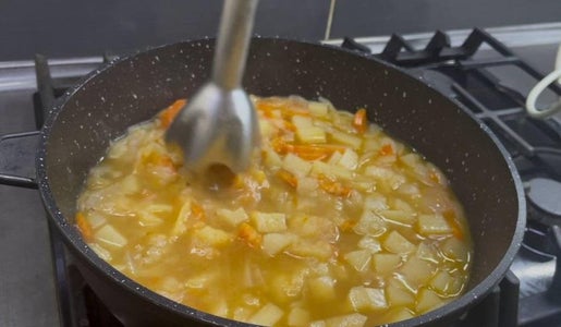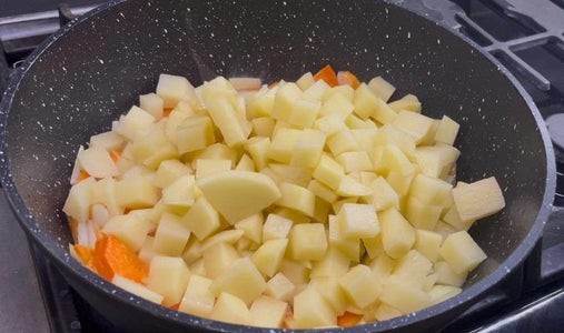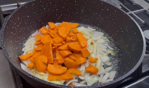 Then, in the same pan, we sauté onion and carrot, add potatoes and spices, cover and simmer until tender.