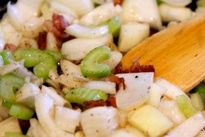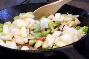 Into the hot fat, add 2 tbsp of butter. When butter has melted, add in garlic, stir, and throw in your roughly chopped onions and celery. Sautee until soft. Deglaze with a little bit of white wine, beer, or stock.