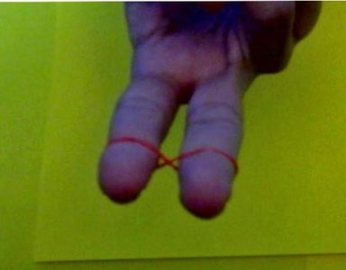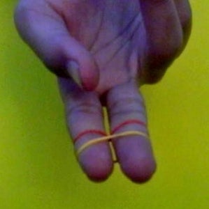 Take another rubber band. Without twisting it, simply place it on your fingers, on top of the previous band.