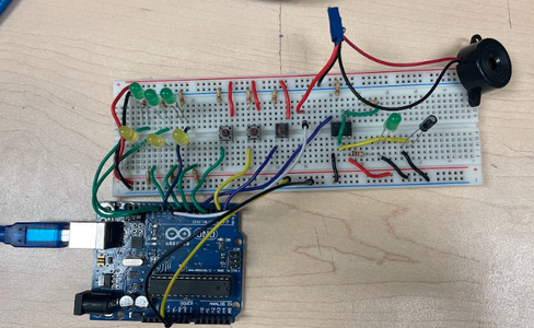The project's main controls that the player interacts with are pressing the 3 push buttons to play. The goal is to press the button that corresponds to the turned-on yellow LED as fast as you can. The green LEDs indicate the next yellow LED. When the song finishes, your score will appear on the red LED. If the LED is blinking then that means you win the game and if it does not blink that means you failed. Make sure to press the buttons enough for the input to be accepted. This project is meant for those who have some experience with being able to cut wires and basic circuit knowledge.