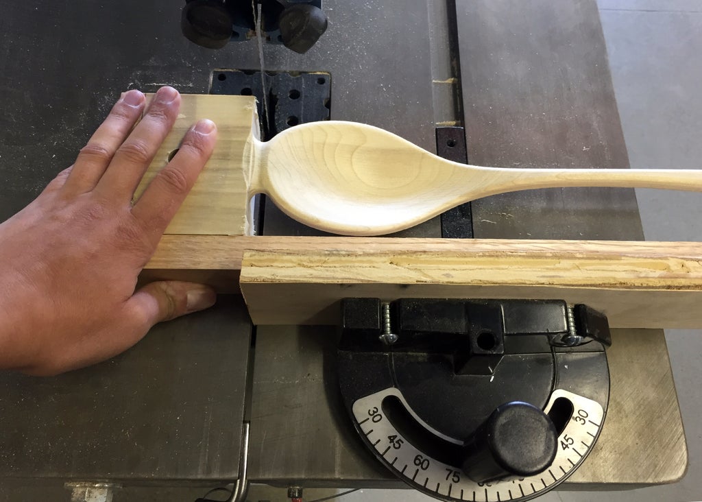 2) Take a scrap piece of rectangular stock and place it in front of the miter, so that the front rectangular prism of the spoon is resting against it.