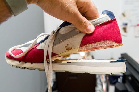 Eerste stap is de schoen ontbinden. Door hitte zal de lijm van de schoenen smelten en kan je de bovenkant van je sneaker scheiden van de zool. Hiervoor kan je kokend water gebruiken of een heat gun. Plaats de volledige schoen in een kom met kokend water, tot de zool loskomt en je deze kan scheiden van de bovenkant van de schoen.