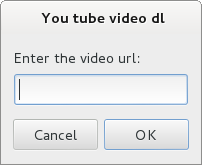 #================================= # Get Youtube video #------------------------------------------------- # get video video="" video=$(zenity --entry \ --title="You tube video dl" \ --text="Enter the video url:" \ --entry-text "$video") youtube-dl $video