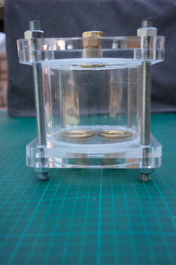 Parts: hemp fibre, mineral oil, brass union with pipe connector (3), pipe rings (3), locknuts (3), threaded rod (14mm x4), acrylic tube (10 cm) lid 1 (10 mm), lid 2 (10 mm).