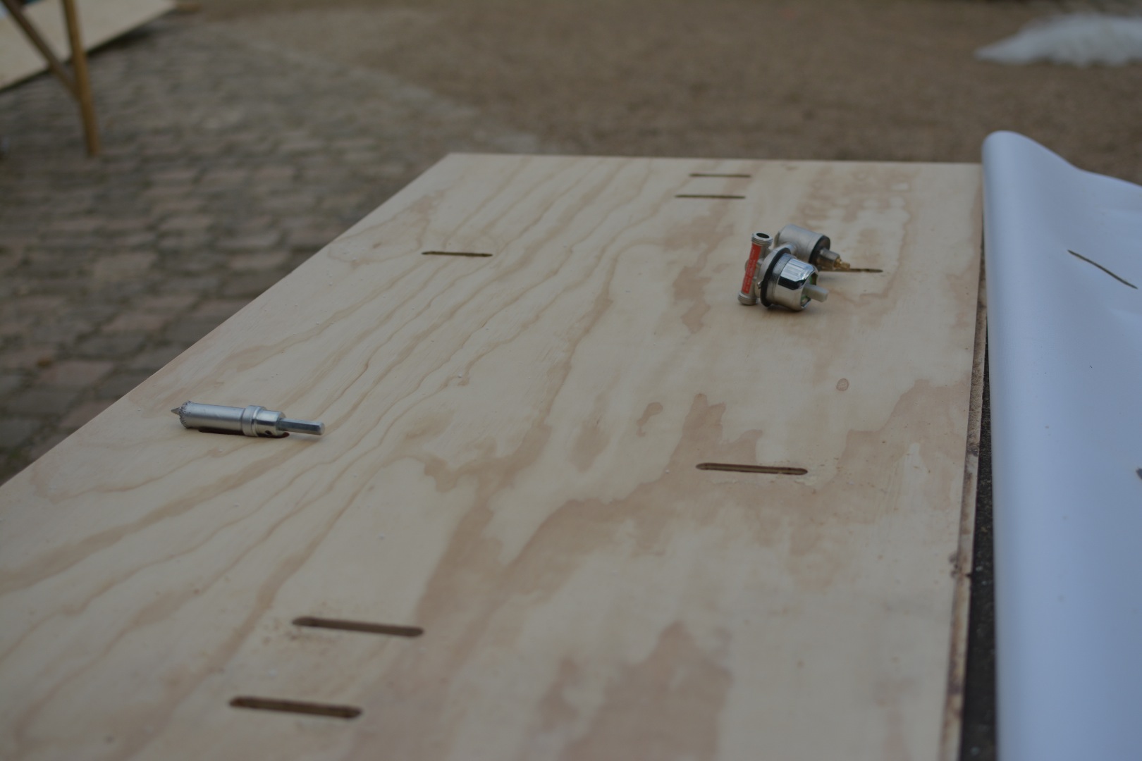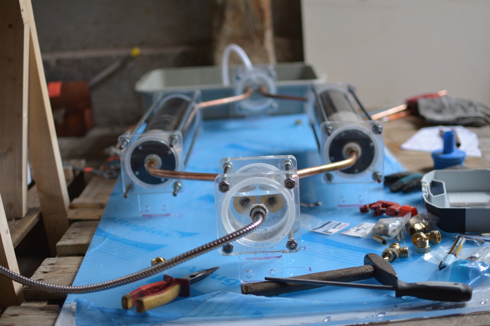 Left over acrylic sheets, and ’little plastic cones’ copper pipe or random hose, paper, cut pipe and threaded rod, packaging material, tools and components you might never use again though all of them can be used to fix Showerloop - it’s always good to have tools :)